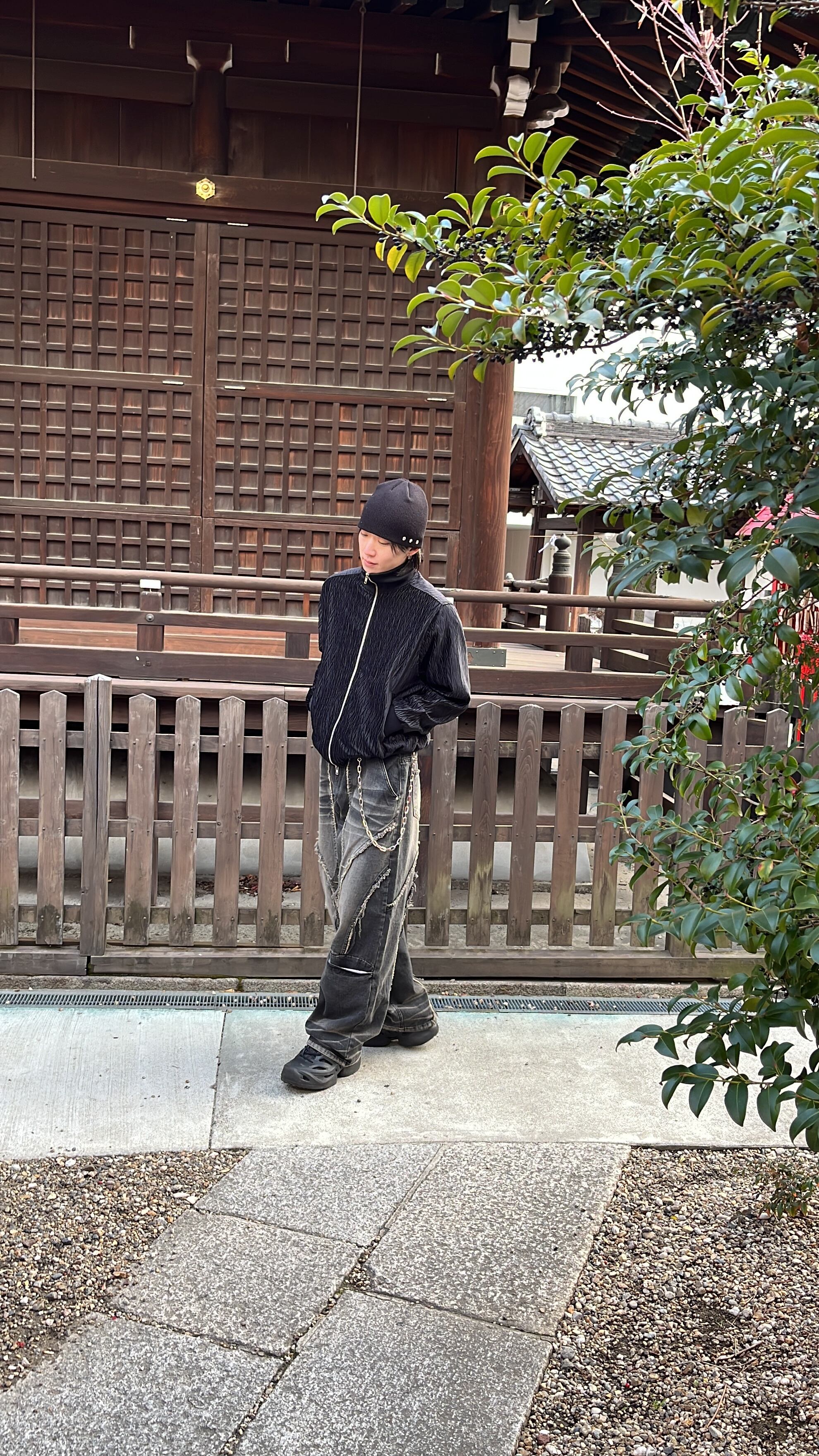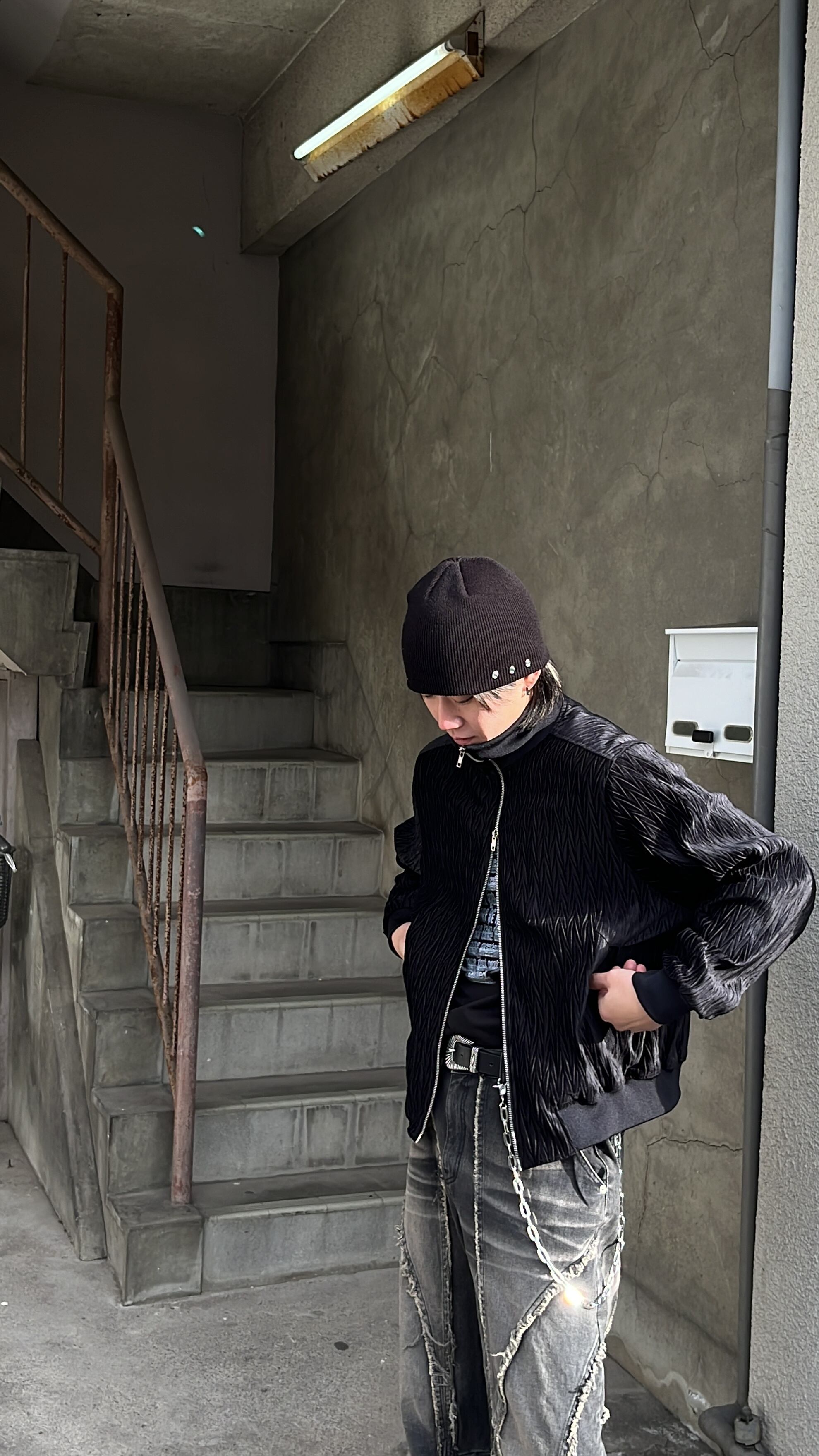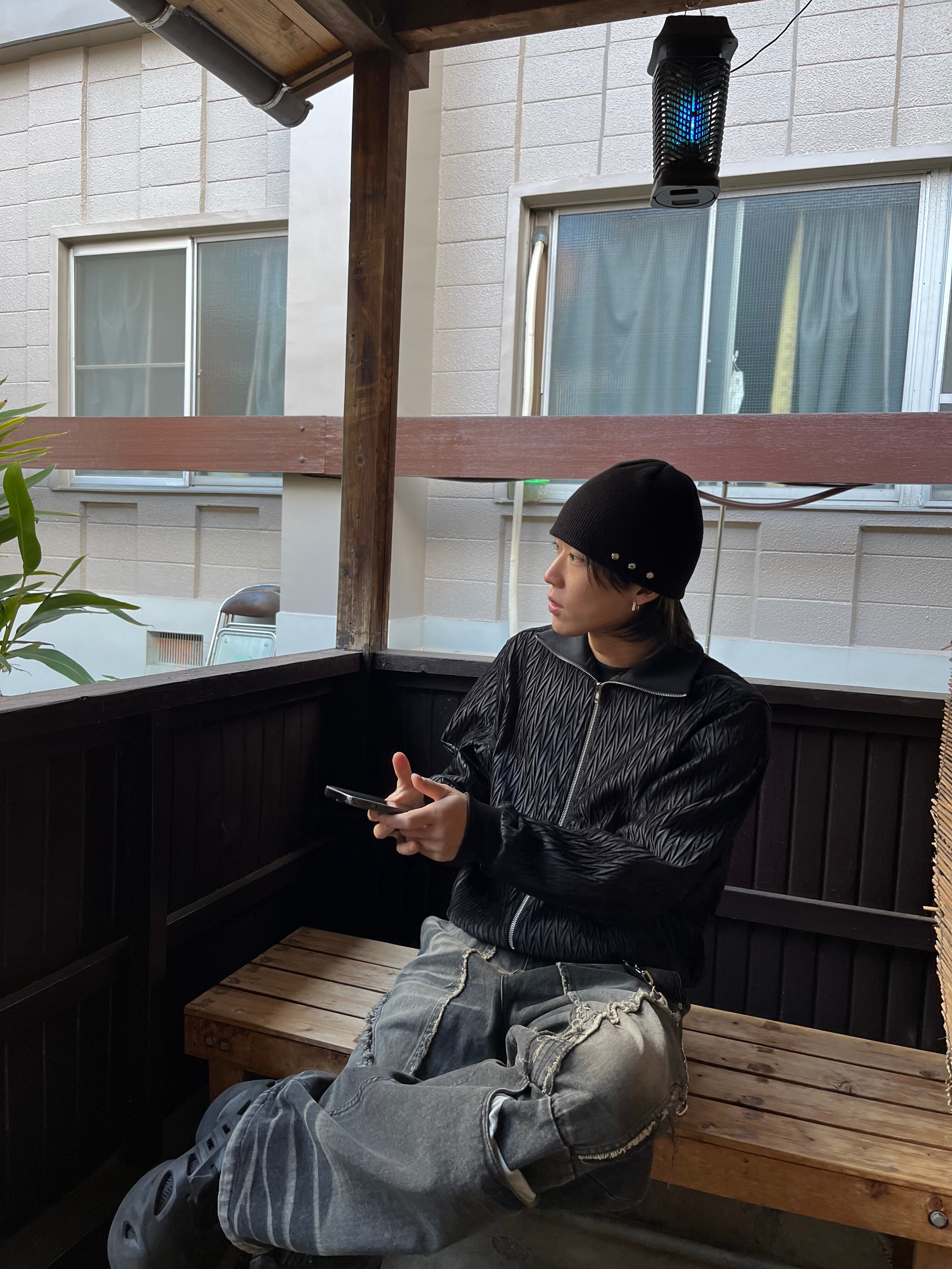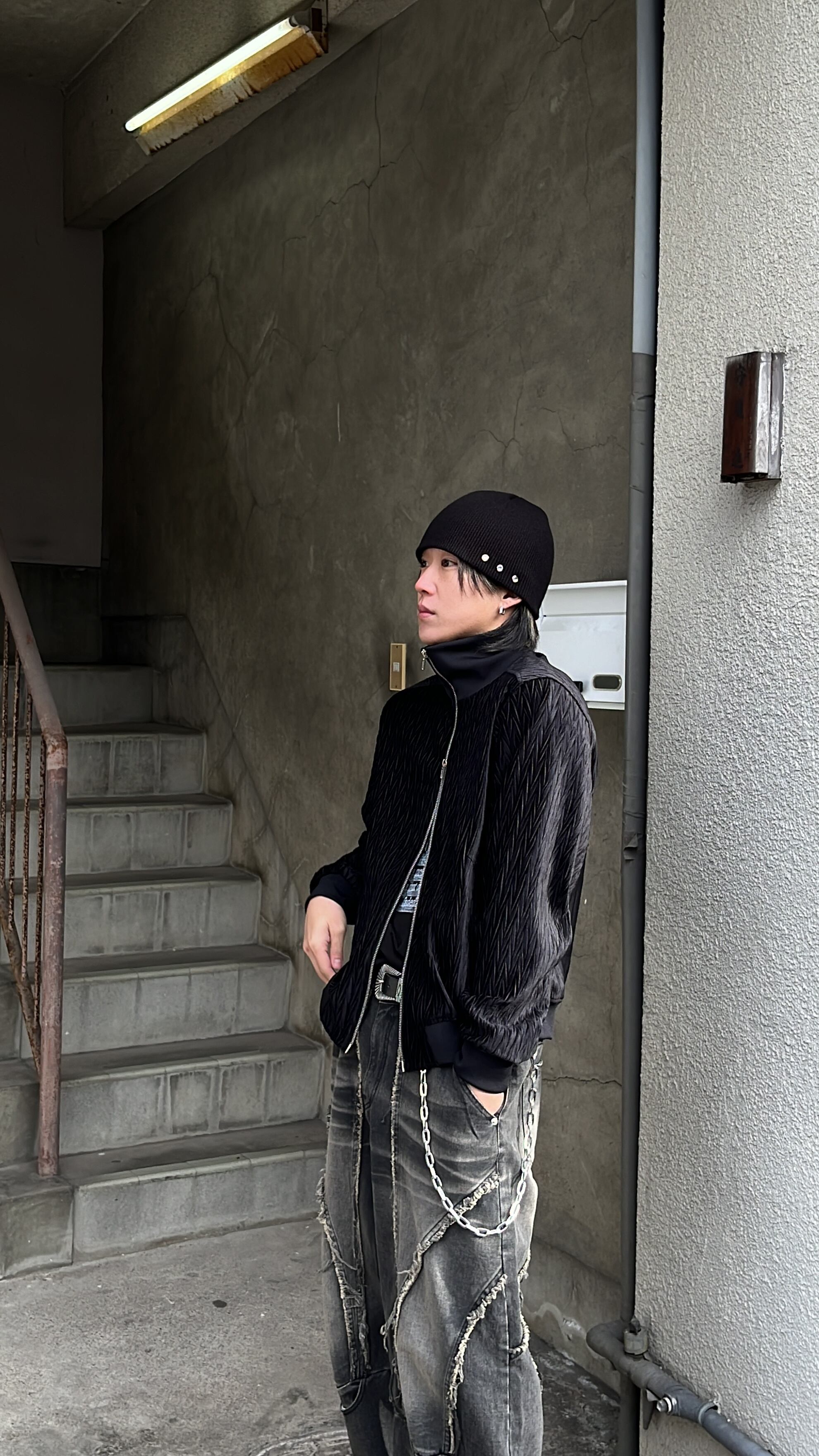 スタンドネックなので襟を立てて