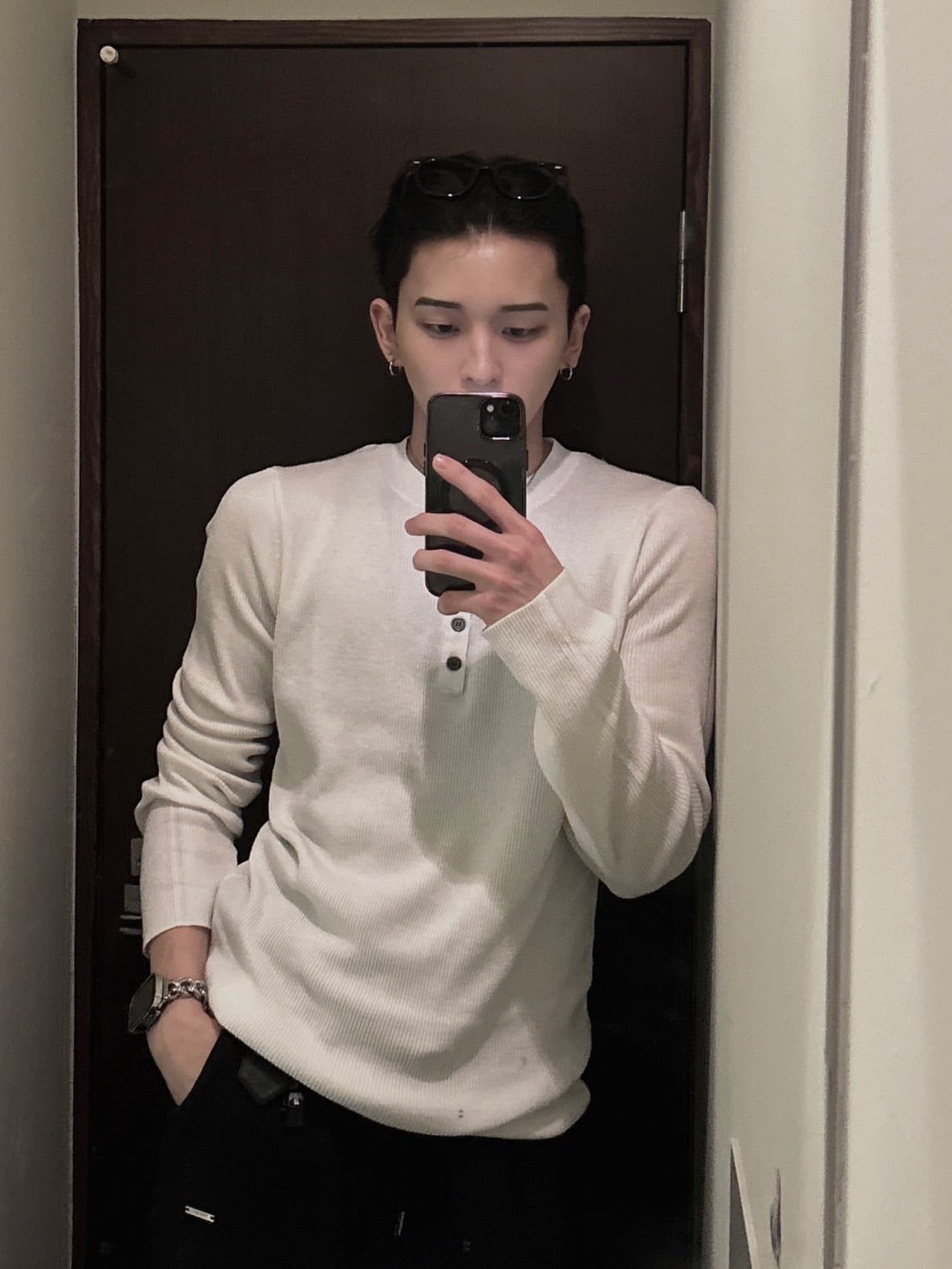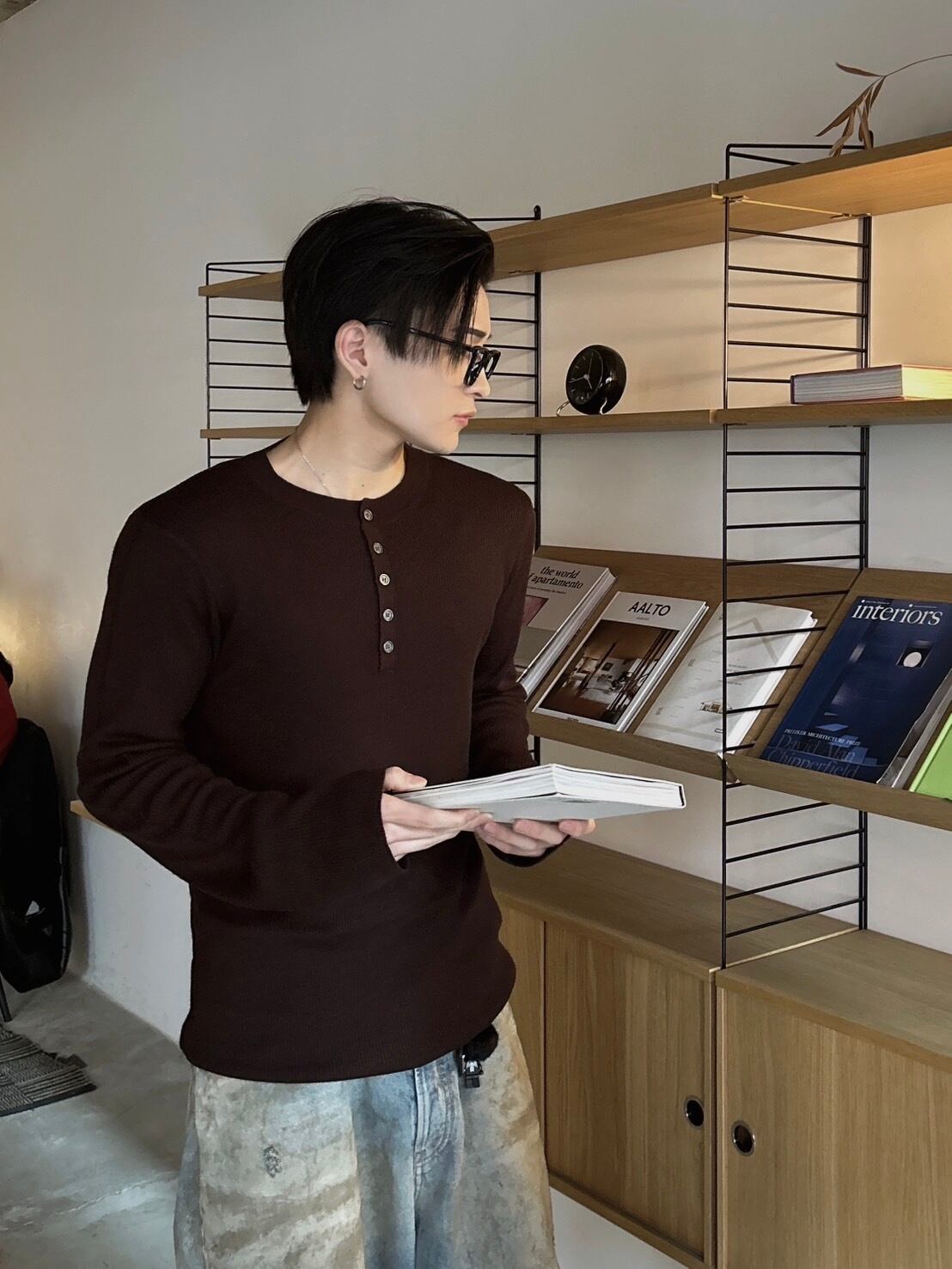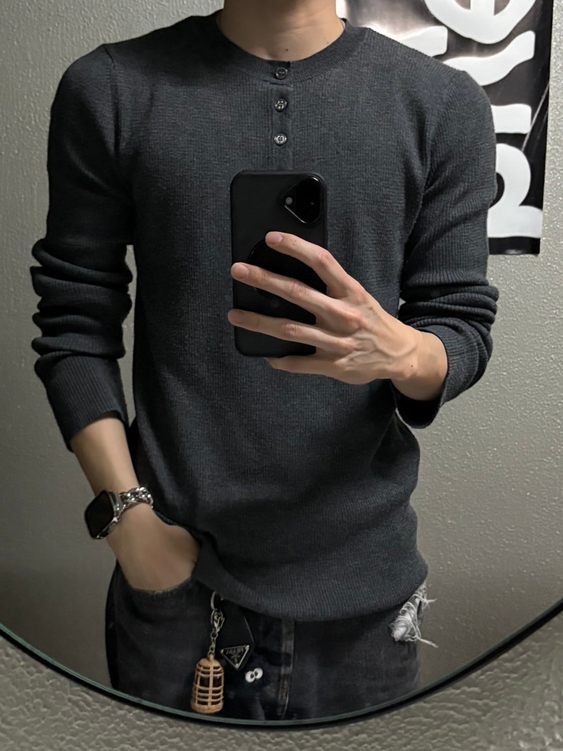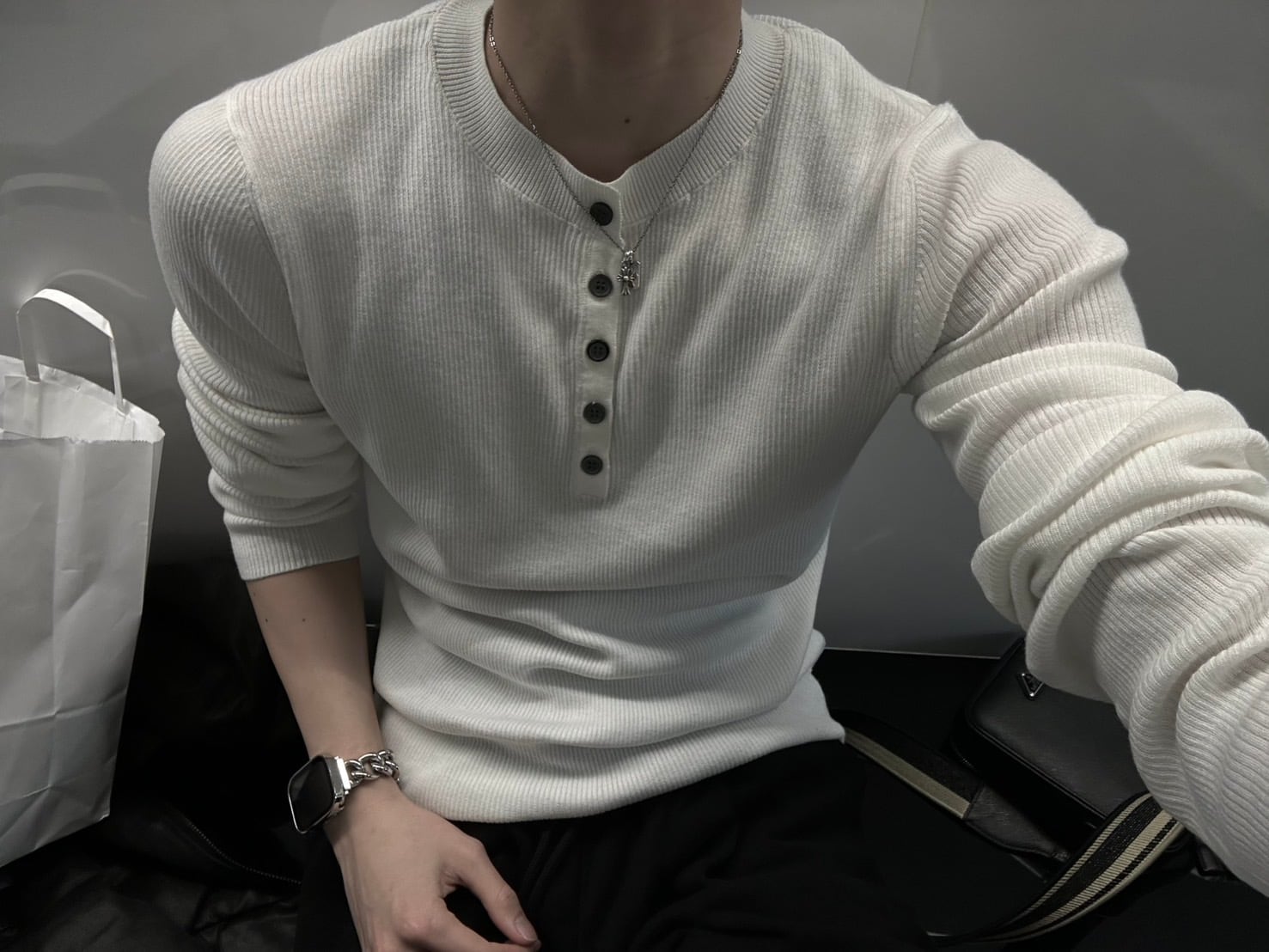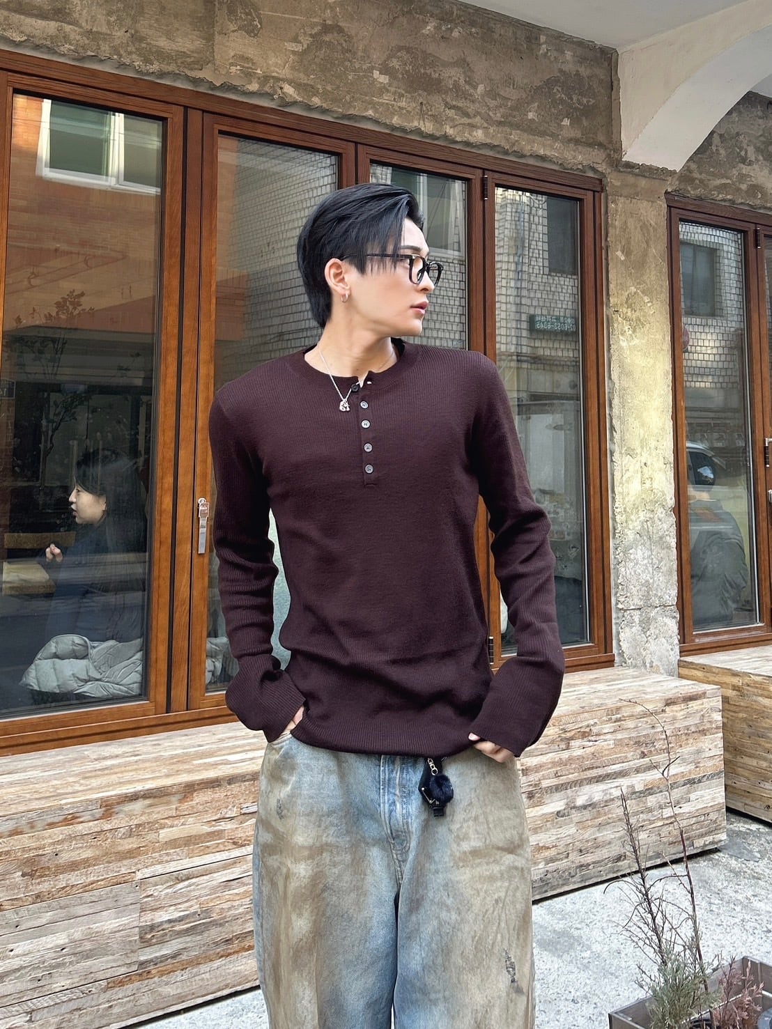 トレンドのヘンリーネックボタンデザインが